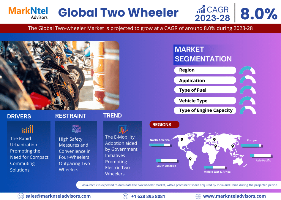 As indicated in the latest market research report published by Markntel Advisors, “Two Wheeler Research Report: Forecast (2023-2028)”, this report offers a detailed analysis of the industry, featuring insights into the Two Wheeler industry. It encompasses competitor and geographical analyses, as well as recent advancements in the market.